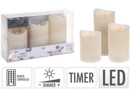 Sada LED sviečok valcovitého tvaru v rôznych veľkostiach. Simulujú útulné blikanie plameňov, s diaľkovým ovládaním, stmievačom a časovačom.
