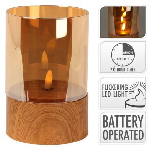 sviečka LED pr. 10 x 15cm PH / sklo, blikajúci plameň, časovač, IMITÁCIA DREVA / JANTAR.SKLO
