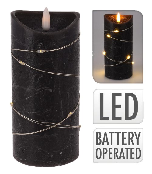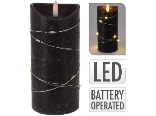 priemer: 7 cm výška: 15 cm farba: čierna LED sviečka valcovitého tvaru (1LED) dekoratívny LED strieborný drôtik (10LED)
