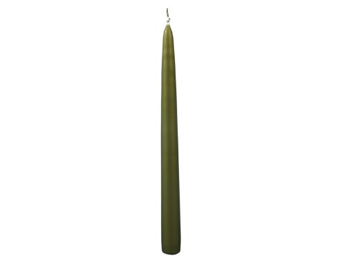 Stolová sviečka kónického tvaru. Má hladký povrch v matnom prevedení. Bude ozdobou každej vianočnej dekorácie. Doba horenia: 6 hodín. Rozmery: spodný priemer 2 cm, výška: 24 cm. Farba: olivová.