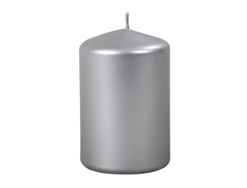 Sviečka v tvare valca s hladkým povrchom, v prevedení metalický lesk. Vo vianočných dekoráciách a upúta pozornosť. Doba horenia: 30 hodín. Rozmery: priemer 6 cm, výška 9 cm. Farba: strieborná.