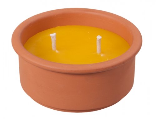 Žltá sviečka s dvoma knôtmi proti komárom v keramickej terakotovej kolmej miske FLOWER s vôňou Citronella. Hmotnosť: 400g. Veľkosť: d15 x 7 cm.