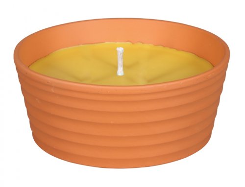 Vonná sviečka v terakotovej žardinke. Sviečka má jeden knôt a vonia po citronele, tradičnému nástroju na odpudzovanie obtiažneho hmyzu. Vhodná na použitie v exteriéri. Hmotnosť náplne: 250 g. Rozmery: priemer 13 cm, výška 6 cm. Farba: žltá.
