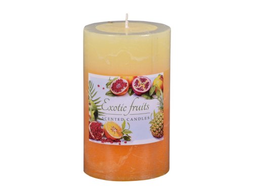 Dekoratívna rustikálna sviečka s vôňou exotického ovocia prináša sviežu a sladko ovocnú arómu, ktorá oživí každý interiér. Trojfarebné prevedenie s prechodom teplých odtieňov pôsobí energicky a optimisticky. Vhodná pre celoročné použitie aj doplnenie dekorácií. Horí rovnomerne až 65 hodín. Rozmery: priemer 7 cm, výška 12 cm. Farba: žltooranžová.