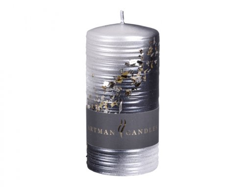 Sviečka v tvare valca má ľahko trblietavý, lesklý povrch. Je zdobená pomyselnou farebnou šerpou v kombinácii s lesklou dekoráciou. Efektný bytový doplnok. Doba horenia: 84 hodín. Rozmery: priemer 7 cm, výška 14 cm. Farba: zlato-strieborná.