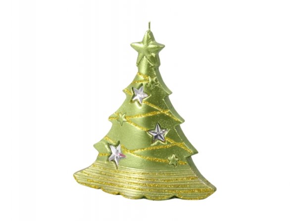 Olivová vianočná sviečka v tvare vianočného stromčeka zdobená striebornými a olivovými hviezdičkami a zlatými zárezmi. Veľkosť: 15 x 16 cm.