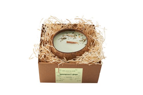 Sviečka z kokosu - vôňa Citrónová tráva & zázvor - Sójové sviečky v kokosovej škrupine sú krásnou ozdobou a dekoráciou. Sviečky neobsahujú parafín, ktorý je vedľajším produktom ropného priemyslu. Spaľovaním parafínu sa do vzduchu uvoľňujú nebezpečné toxíny, ktoré potom vdychujeme. Sviečka obsahuje bavlnený knôt, teda čisto prírodný, bez obsahu bóraxu, do ktorého sa inak knôty namáčajú, aby sa umelo docielilo lepšie horenie. Do vosku pridávame iba kvalitné esenciálne oleje z lokálnych zdrojov. Sviečky sú odlievané a zdobené ručne. Každá sa teda od seba trochu líši. Sójový vosk horí približne dvakrát dlhšie, než ten parafínový, pri 100g vosku je to +- 20 hodín.