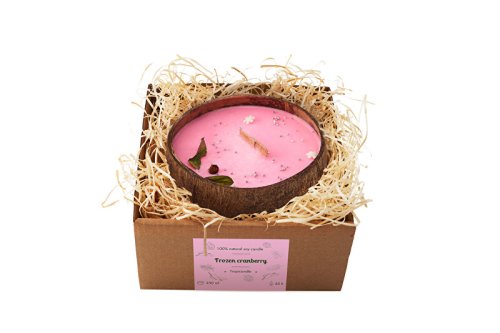 Sviečka v kokose - Sójové sviečky v kokosovej škrupine sú krásnou ozdobou a dekoráciou. Vôňa Frozen Cranberry je príjemná sladká vôňa brusníc doplnená o nádychy bazy čiernej a jablka. Sviečky neobsahujú parafín, ktorý je vedľajším produktom ropného priemyslu. Spaľovaním parafínu sa do vzduchu uvoľňujú nebezpečné toxíny, ktoré potom vdychujeme. Sviečka obsahuje bavlnený knôt, teda čisto prírodný, bez obsahu bóraxu, do ktorého sa inak knôty namáčajú, aby sa umelo docielilo lepšie horenie. Do vosku sú pridané iba kvalitné esenciálne oleje z lokálnych zdrojov. Sviečky sú odlievané a zdobené ručne. Každá sa teda od seba trochu líši. Sójový vosk horí približne dvakrát dlhšie, ako ten parafínový, pri 100 g vosku je to +- 20 hodín.