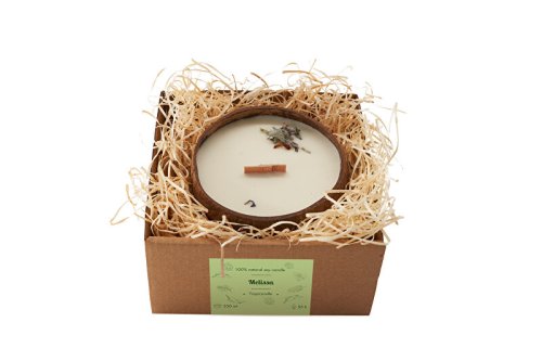 Sviečka v kokose - vôňa Melissa (Medunka) - Sójové sviečky v kokosovej škrupine sú krásnou ozdobou a dekoráciou. Sviečky neobsahujú parafín, ktorý je vedľajším produktom ropného priemyslu. Spaľovaním parafínu sa do vzduchu uvoľňujú nebezpečné toxíny, ktoré potom vdychujeme. Sviečka obsahuje bavlnený knôt, teda čisto prírodný, bez obsahu bóraxu, do ktorého sa inak knôty namáčajú, aby sa umelo docielilo lepšie horenie. Do vosku pridávame iba kvalitné esenciálne oleje z lokálnych zdrojov. Sviečky sú odlievané a zdobené ručne. Každá sa teda od seba trochu líši. Sójový vosk horí približne dvakrát dlhšie ako ten parafínový, pri 100 g vosku je to +- 20 hodín.