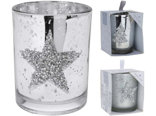 Sviečka v skle 100×80 mm, vonná, v darčekovej krabičke, mix strieborná a modrá.