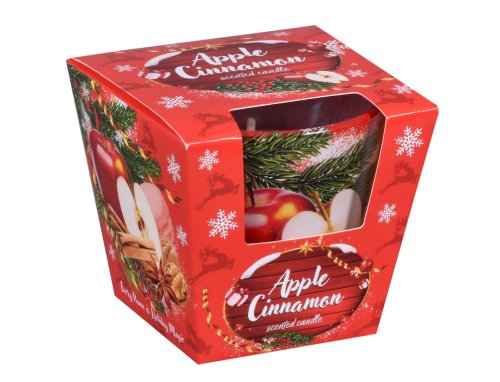 Vonná sviečka v skle s vôňou jablka a škorice prináša hrejivú, sladko korenistú vôňu, ktorá pripomína sviatočné pečenie a zimnú pohodu. Sklenená nádoba s potlačou je doplnená darčekovou krabičkou. Horí približne 30 hodín. Hmotnosť: 115 g. Farba: červená.