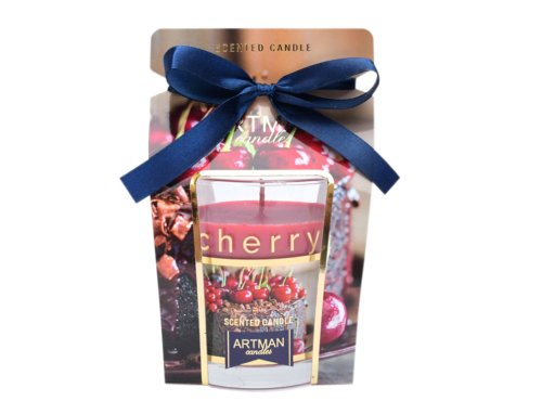 Sviečka v skle s vôňou čerešňového koláča. Sviečka je zabalená v papierovej darčekovej taštičke s modrou saténovou mašľou. Hmotnosť náplne: 130g. Výška: 8 cm, šírka: 7 cm.