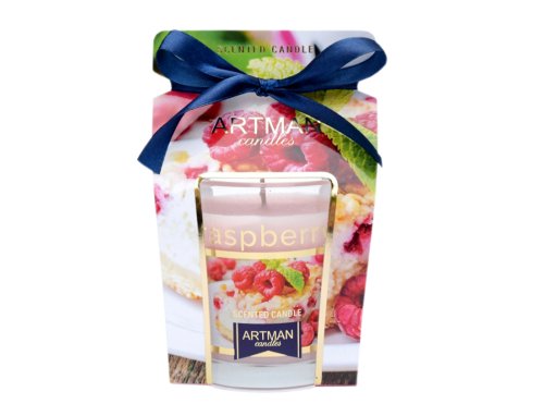 Sviečka v skle s vôňou malinového koláča. Sviečka je zabalená v papierovej darčekovej taštičke s modrou saténovou mašľou. Hmotnosť náplne: 130g. Výška: 8 cm, šírka: 7 cm.