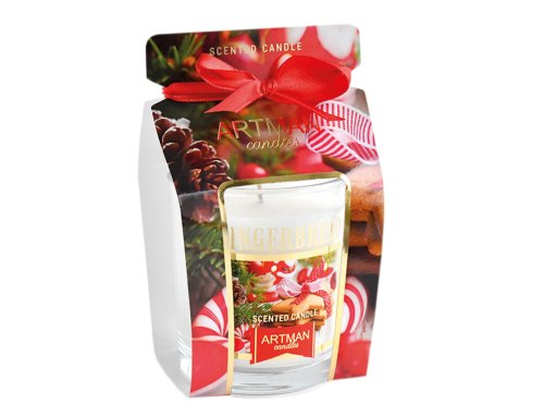 Vonná sviečka v skle a papierovej krabičke s mašličkou. Vôňa: perníček. Hmotnosť náplne: 130 g. Výška: 8,3 cm, šírka: 7,4 cm.