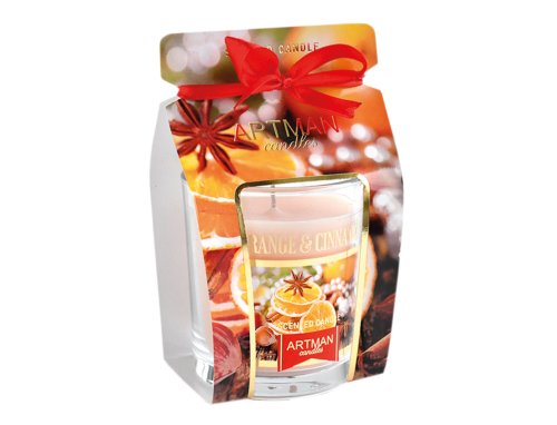 Vonná sviečka v skle a papierovej krabičke s mašličkou. Vôňa: pomaranč a škorica. Hmotnosť náplne: 130 g. Výška: 8,3 cm, šírka: 7,4 cm.