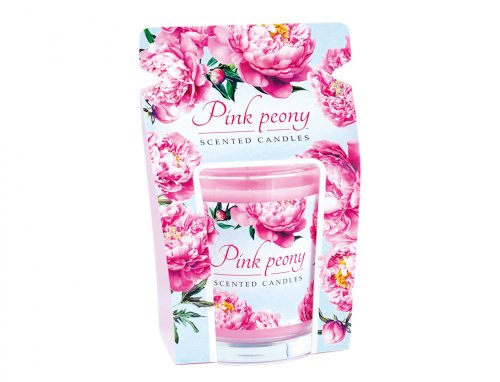 Vonná sviečka v skle s papierovou etiketou a papierovým prebalom, zdobené bohatými kvetmi ružových pivoniek. Bude krásnym darčekom. Okolo seba bude šíriť nežnú vôňu pivoniek. Čas horenia: 32 h. Hmotnosť náplne: 130 g. Rozmery: priemer 7,4 cm, výška 8,3 cm. Farba: ružovo-fialová.