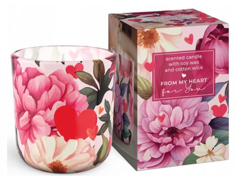 Prémiová vonná sviečka v skle. Je vyrobená zo sójového vosku a má bavlnený knôt. Poteší zmyselnou kvetinovou vôňou. Sklo sviečky aj krabička v ktorej je zabalená sú zdobené kvetinovými motívmi a srdiečkami. Vhodný ako darček, najmä o valentínu. Hmotnosť náplne je 150 g. Doba horenia: 33 hodín. Farba: ružová, biela.