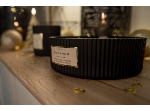 Vonná sviečka v skle s ryhovaným dizajnom, ktorá vytvára príjemnú atmosféru vďaka svojej čiernej farbe a elegantnému tvaru. Jej rozmery sú 178 x 60 mm.