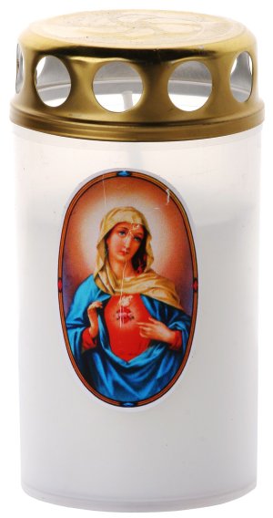Sviečka Vatikánka určená na cintoríny v plastovom priehľadnom obale s nálepkou s rôznymi náboženskými motívmi. Jej súčasťou je plechové viečko, ktoré slúžia ako ochrana pred poveternostnými vplyvmi. Doba horenia, až 40 hodín, závisí od klimatických podmienok. Určené pre vonkajšie použitie.