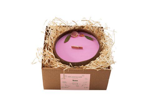 Sviečka z kokosu - vôňa Ruže - Sójové sviečky v kokosovej škrupine sú krásnou ozdobou a dekoráciou. Sviečky neobsahujú parafín, ktorý je vedľajším produktom ropného priemyslu. Spaľovaním parafínu sa do vzduchu uvoľňujú nebezpečné toxíny, ktoré potom vdychujeme. Sviečka obsahuje bavlnený knôt, teda čisto prírodný, bez obsahu bóraxu, do ktorého sa inak knôty namáčajú, aby sa umelo docielilo lepšie horenie. Do vosku pridávame iba kvalitné esenciálne oleje z lokálnych zdrojov. Sviečky sú odlievané a zdobené ručne. Každá sa teda od seba trochu líši. Sójový vosk horí približne dvakrát dlhšie, ako ten parafínový, pri 100 g vosku je to +- 20 hodín.