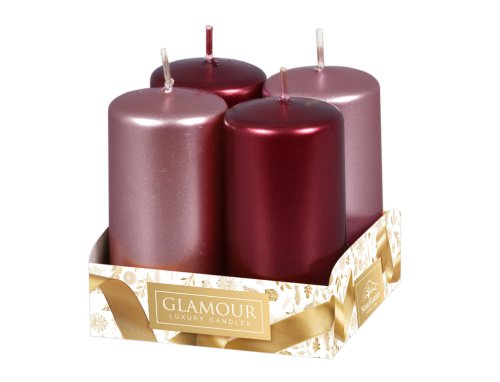 Adventné sviečky v metalickom lesku v tvare valca s plochou hlavou. V klasických vianočných farbách. Materiál parafín. Doba horenia: 9 hodín. Balenie obsahuje 4 ks rovnako veľkých adventných sviečok v 2 farbách. Rozmery: priemer 4cm, výška 8 cm. Farba: ružová, červená.