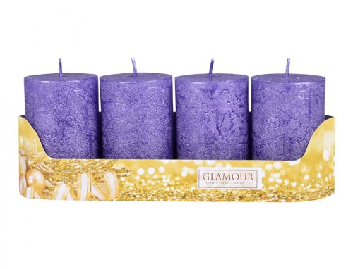 Rustikálne adventné sviečky v tvare valca. Sviečky majú metalický povrch. Budú sa vynímať v modernom, dobovom aj rustikálnom interiéri. V balení sú 4 kusy. Doba horenia: 21 hodín. Veľkosť sviečky: priemer 5cm, výška 8cm. Farba: fialová.