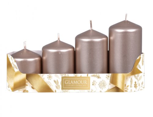 Súprava adventných sviečok stupňovitých. Majú tvar valca a plochú hlavu. Povrch sviečky je metalicky lesklý. Adventný veniec rozžiari. Doba horenia: 8-20 hodín. Rozmery: priemer 5 cm, výška 6/7,5/9/10,5 cm. V balení sú 4 ks sviečok. Farba: šampaň.