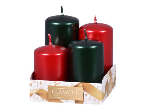Adventné stupňovité sviečky v metalickom lesku s plochou hlavou. V tradičných farbách Vianoc. Rozmery: priemer 4 cm, výška: 6/7/8/9 cm. Doba horenia: 11/12,5/14,5/16,5 h. Materiál: parafín. Balenie obsahuje 4 ks sviečok. Farba: tmavo zelená, červená.