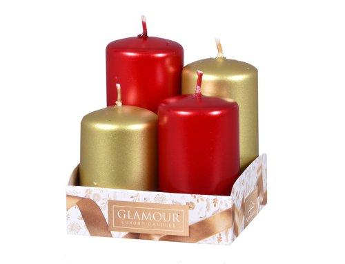 Adventné stupňovité sviečky v metalickom lesku s plochou hlavou. V tradičných farbách Vianoc. Rozmery: priemer 4 cm, výška: 6/7/8/9 cm. Doba horenia: 11/12,5/14,5/16,5 h. Materiál: parafín. Balenie obsahuje 4 ks sviečok. Farba: červená, zlatá.