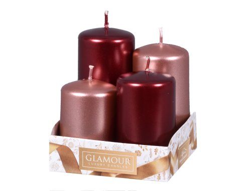 Adventné stupňovité sviečky v metalickom lesku s plochou hlavou. V elegantnej farebnej kombinácii. Rozmery: priemer 4 cm, výška: 6/7/8/9 cm. Doba horenia: 11/12,5/14,5/16,5 h. Materiál: parafín. Balenie obsahuje 4 ks sviečok. Farba: bordová, ružová.