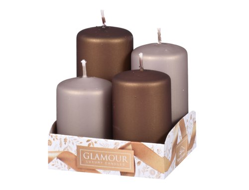 Adventné stupňovité sviečky, matne metalické, s plochou hlavou. V nevšedných farbách. Rozmery: priemer 4 cm, výška: 6/7/8/9 cm. Doba horenia: 11/12,5/14,5/16,5 h. Materiál: parafín. Balenie obsahuje 4 ks sviečok. Farba: gaštanová, béžová.