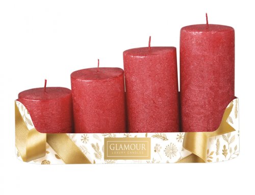 Adventné sviečky s rustikálnym matným povrchom. Sviečky sú stupňovité: priemer: 5 cm, výšky: 6 cm, 8 cm, 10 cm, 12 cm. Farba: červená.