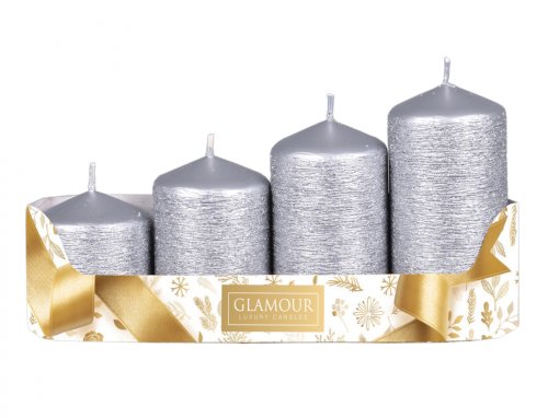 Súprava adventných stupňovitých sviečok v tvare valca, so špicatou hlavou. Majú povrch zdobený škrabaním. Sú veľmi ozdobné a elegantné. Rozmery: priemer 5 cm, výška 6/7,5/9/10,5 cm. Doba horenia: 22 hodín. Materiál: parafín. Súprava obsahuje 4 ks sviečok. Farba: strieborná.