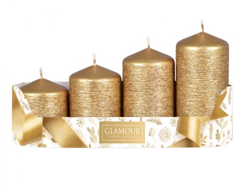 Súprava adventných stupňovitých sviečok v tvare valca, so špicatou hlavou. Majú povrch zdobený škrabaním. Sú veľmi ozdobné a elegantné. Rozmery: priemer 5 cm, výška 6/7,5/9/10,5 cm. Doba horenia: 22 hodín. Materiál: parafín. Súprava obsahuje 4 ks sviečok. Farba: zlatá.