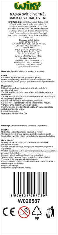 Svietiaca maska Obsahuje: svietiace tyčinky, masku, špagát 6 rôznych farieb.