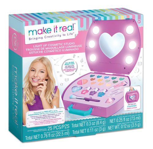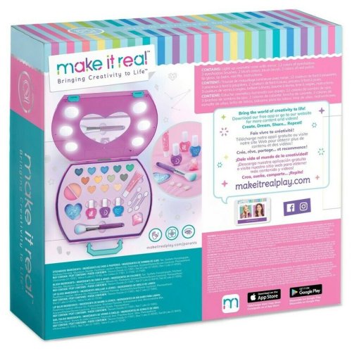 Obsahuje kozmetické puzdro so svetlom a zrkadlom, 12 rôzne farebných očných tieňov, 3 štetce na očné tiene, 2 lícenky, štetec na lícenku, 3 rôzne farebné laky na nechty, lesk na pery, balzam na pery, pilník na nechty a inštrukcie. Vhodné pre deti od 8 rokov.