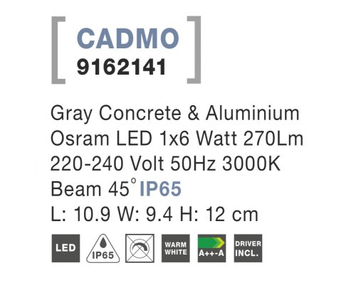 Svietidlo je vyrobené z vysoko kvalitného hliníka a šedého betónu a je odolné proti tryskajúcej vode a prachu podľa štandardu IP65 . Vďaka tomu je jeho životnosť veľmi dlhá. Energeticky úsporná LED technológia navyše ušetrí vašu peňaženku.