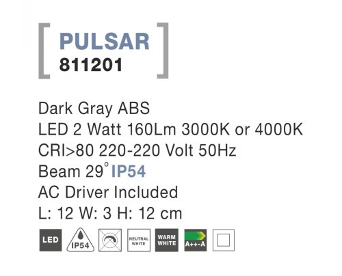 Nástenné svietidlo Nova Luce PULSAR STEP GREY 4 bolo navrhnuté špeciálne pre osvetlenie vonkajšieho schodiska, ale využitie nájde aj na terase či záhrade. Vďaka ochrannému krytiu IP54 proti prírodným vplyvom je vodeodolný a nevadí mu ani zaprášené prostredie. Futuristický dizajn upúta vašu pozornosť aj v prostredí vášho domu či moderného bytu. Spracovanie z vysoko kvalitného plastu ABS vám zaručí jeho spoľahlivosť po dlhú dobu.