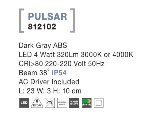 Nástenné svietidlo Nova Luce PULSAR STEP GREY 6 bolo navrhnuté špeciálne pre osvetlenie vonkajšieho schodiska, ale využitie nájde aj na terase či záhrade. Vďaka ochrannému krytiu IP54 proti prírodným vplyvom je vodeodolný a nevadí mu ani zaprášené prostredie. Futuristický dizajn upúta vašu pozornosť aj v prostredí vášho domu či moderného bytu. Spracovanie z vysoko kvalitného plastu ABS vám zaručí jeho spoľahlivosť po dlhú dobu.
