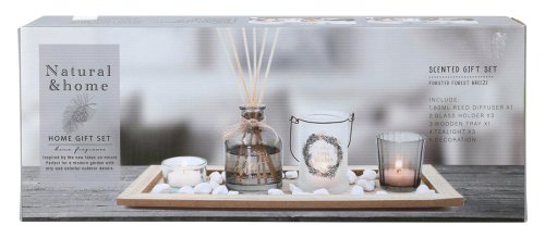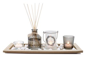 Nádherná sada difuzéra s doplnkami bude zaujímavou ozdobou vašej domácnosti. Obsahuje sviečku, kalíšky na čajovú sviečku a spomínaný difuzér s ratanovými tyčinkami.