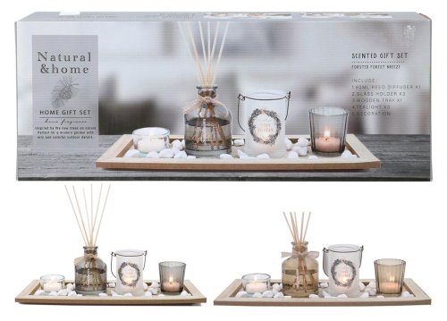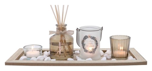 Svietnik / diffuser 36 x 14 x 1 cm, 5 dielov + dekorácia, drevo / sklo.