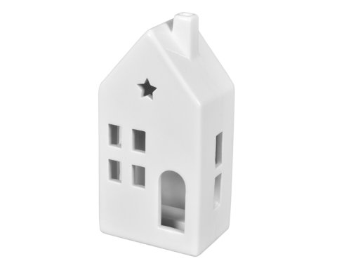 LED dekorácia v podobe domčeka, vhodný na obdobie Vianoc a zimy. Obsahuje ľad svietidlo, po zapnutí vytvára milý dojem, že sa v domčeku svieti. Pôsobí veľmi útulne, svojim neutrálnym dizajnom sa hodí do každého interiéru. Materiál: glazovaná keramika. Vhodný do interiéru. Rozmery: dĺžka 9 cm, hĺbka 6 cm, výška 18 cm. Farba: biela.