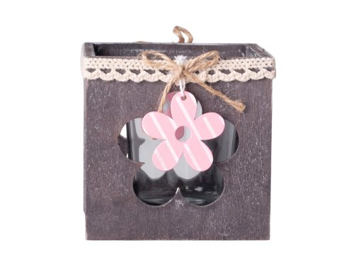 Drevený svietnik v tvare kvietku pre čajovú sviečku, dostupný v prírodnej a ružovej farbe. Jeho rozmery sú 85 mm.