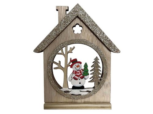 Svietnik drevo, sklo 95×110 mm domček so snehuliakom na postavenie s glitrom, prírodná, farebná