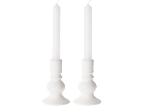 Súprava dvoch bielych keramických svietnikov s jemným reliéfom, doplnená o dve kónické sviečky v ladiacom tóne. Ideálna pre sviatočný stôl, romantickú večeru alebo ako elegantná dekorácia po celý rok. Balenie poteší aj ako darček.