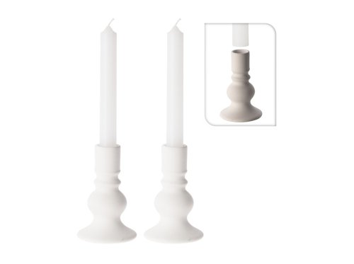 Súprava dvoch bielych keramických svietnikov s jemným reliéfom, doplnená o dve kónické sviečky v ladiacom tóne. Ideálna pre sviatočný stôl, romantickú večeru alebo ako elegantná dekorácia po celý rok. Balenie poteší aj ako darček.