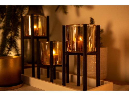 Súprava troch kovových svietnikov so sklenenými vložkami v čiernej farbe je vhodná pre čajové sviečky. Stabilná konštrukcia zaisťuje bezpečné svietenie, zatiaľ čo kombinácia kovu a skla dodáva dekorácii elegantný a moderný vzhľad. Svietniky je možné použiť samostatne alebo spoločne pre efektný stolný aranžmán a dekoratívny účinok.