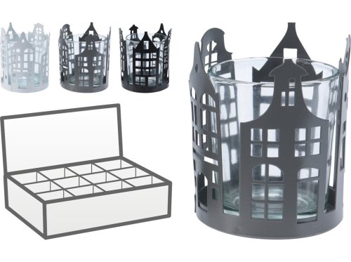 Kovový svietnik o rozmere 60×80 mm určený pre čajovú sviečku, zdobený motívom domčekov. Farebné prevedenie je dodávané v mixe, jednotlivé kusy sa môžu líšiť odtieňom aj vzhľadom dekoru.