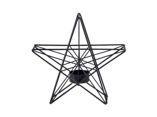 Tento kovový svietnik v tvare hviezdy s rozmerom 190 × 60 × 190 mm je určený pre čajové sviečky. Elegantné čierne prevedenie dodáva interiéru štýlový vzhľad. Stabilná konštrukcia a bezpečné umiestnenie sviečky umožňuje dekoratívny aranžmán na stôl, parapet alebo poličku.