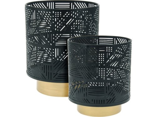 Súprava dvoch kovových svietnikov s rozmermi 150 × 185 mm a 180 × 215 mm je určená pre maxi čajové sviečky. Čierne prevedenie dodáva interiéru elegantný a moderný vzhľad. Stabilná konštrukcia zaisťuje bezpečné svietenie, vhodné pre stolný aranžmán, parapet alebo poličku.